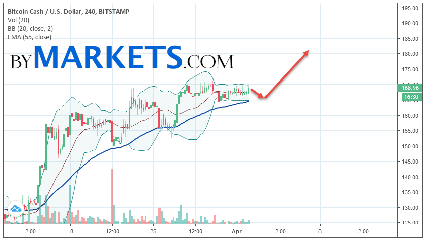 As part of the Bitcoin Cash forecast, the test is expected at the level of 166. Where should we expect an attempt to continue the growth of BCH/USD and the further development of the upward trend. The purpose of this movement is the area near the level of 181. The conservative area for buying of Bitcoin Cash is located near the lower border of the Bollinger Bands indicator strip at level 163.