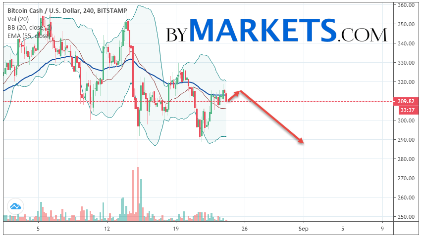 Cryptocurrency Bitcoin Cash (BCH/USD) is trading at 309. Cryptocurrency quotes are trading below the moving average with a period of 55. This indicates a bearish trend on Bitcoin Cash. At the moment, cryptocurrency quotes are moving near the middle border of the Bollinger Bands indicator stripes.