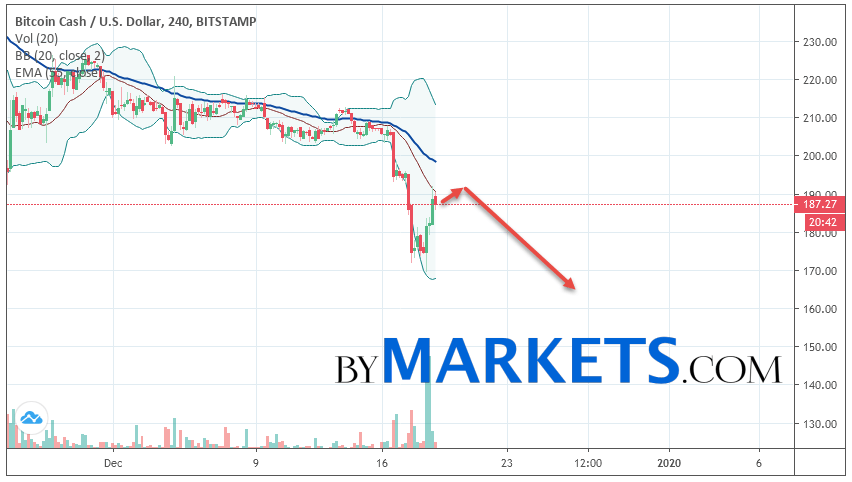 Bitcoin Cash (BCH/USD) forecast and analysis on December 20, 2019 implies a test level of 192. Further, it is expected to continue falling to the area below the level of 165. The conservative area for selling Bitcoin Cash is located area of 214. Canceling the option of falling cryptocurrency will be a breakdown of the level of 220. In this case, we can expect continuation growth.