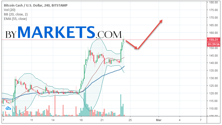 As part of the Bitcoin Cash forecast, the test level is expected to be 149. Where should we expect an attempt to continue the growth of BCH/USD and the further development of the upward trend. The purpose of this movement is the area near the level of 168. The conservative area for buying of Bitcoin Cash is located near the lower border of the Bollinger Bands indicator strip at level 133.