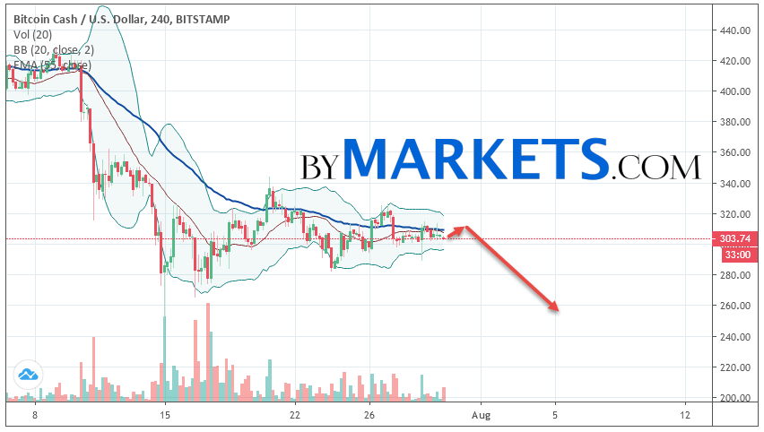 As part of the Bitcoin Cash forecast, a test of the 310 level is expected. Where should we expect an attempt to continue the fall of BCH/USD and further development of the downward trend. The purpose of this movement is the area near the level of 258. The conservative area for sales of Bitcoin Cash is located near the upper border of the Bollinger Bands indicator strip at level 320.