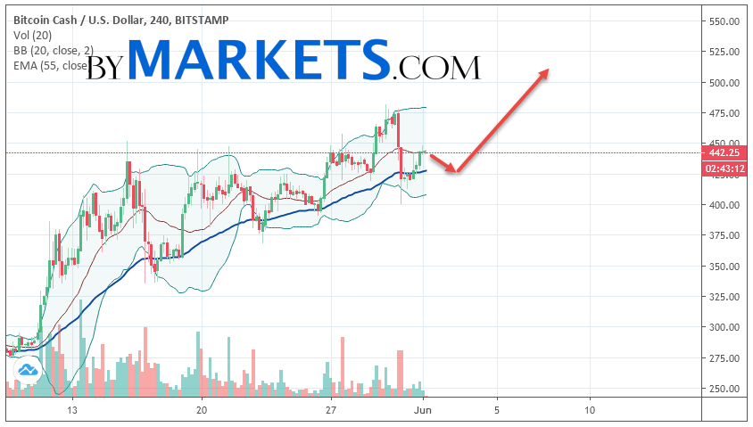 As part of the Bitcoin Cash forecast, the test is expected at 425. Where should we expect an attempt to continue the growth of BCH/USD and the further development of the upward trend. The purpose of this movement is the area near the level of 510. The conservative area for buying of Bitcoin Cash is located near the lower border of the Bollinger Bands indicator strip at level 410.
