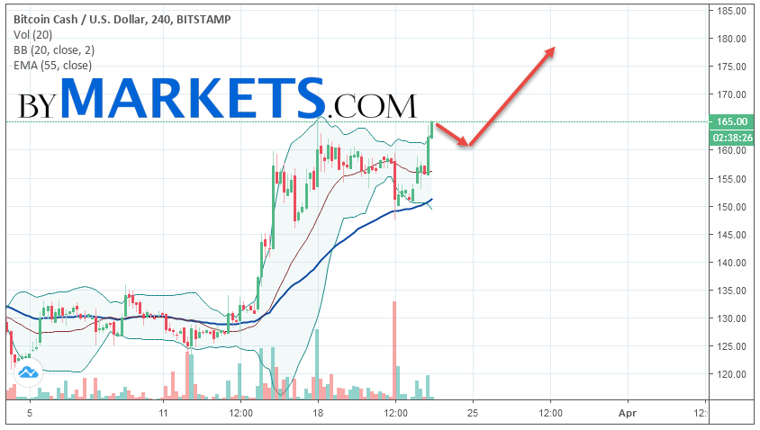 As part of the Bitcoin Cash forecast, the test is expected at the level of 161. Where should we expect an attempt to continue the growth of BCH/USD and the further development of the upward trend. The purpose of this movement is the area near the level of 177. The conservative area for buying of Bitcoin Cash is located near the lower border of the Bollinger Bands indicator strip at level 150.
