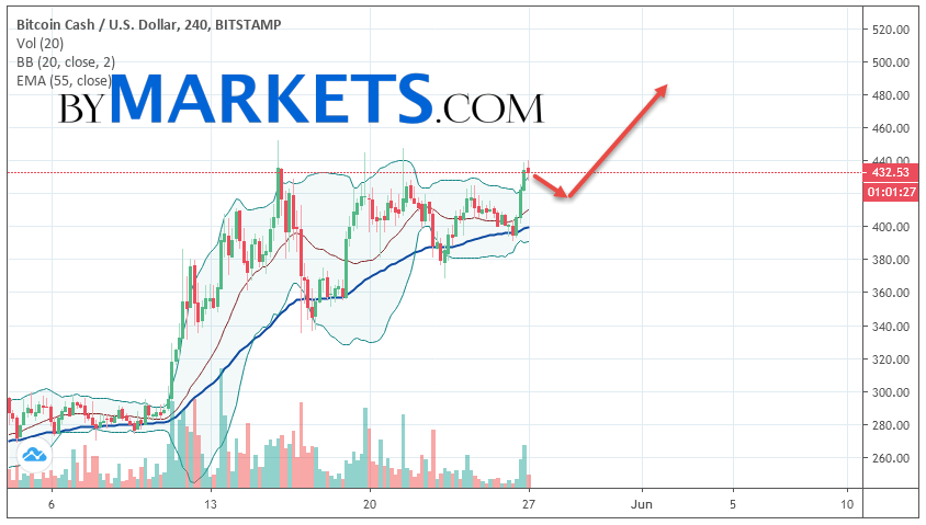 As part of the Bitcoin Cash forecast, the test is expected at the level of 418. Where should we expect an attempt to continue the growth of BCH/USD and the further development of the upward trend. The purpose of this movement is the area near the level of 485. The conservative area for buying of Bitcoin Cash is located near the lower border of the Bollinger Bands indicator bands at the level of 390.