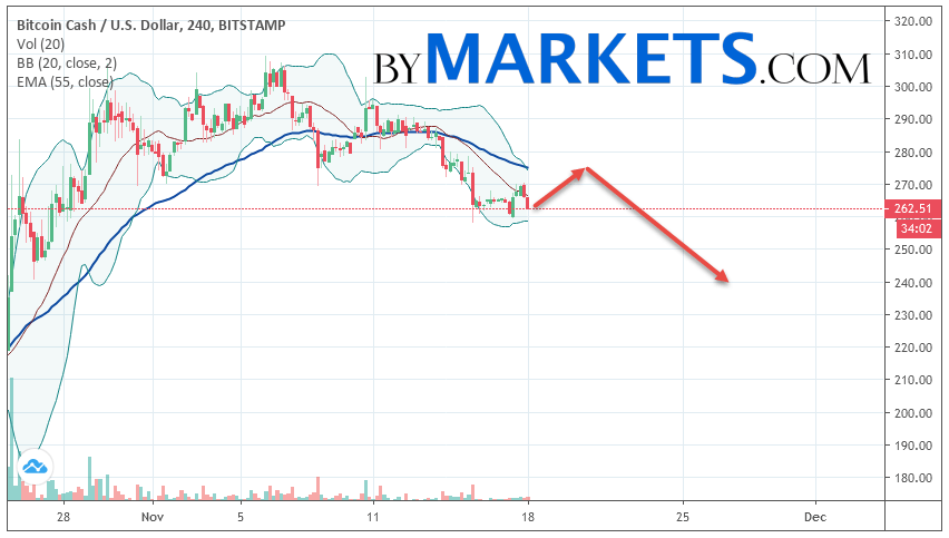 As part of the Bitcoin Cash forecast, a test of level 274 is expected. Where can we expect an attempt to continue the fall of BCH/USD and the further development of a downward trend. The purpose of this movement is the area near the level of 240. The conservative area for sales of Bitcoin Cash is located near the upper border of the Bollinger Bands indicator strip at level 276.