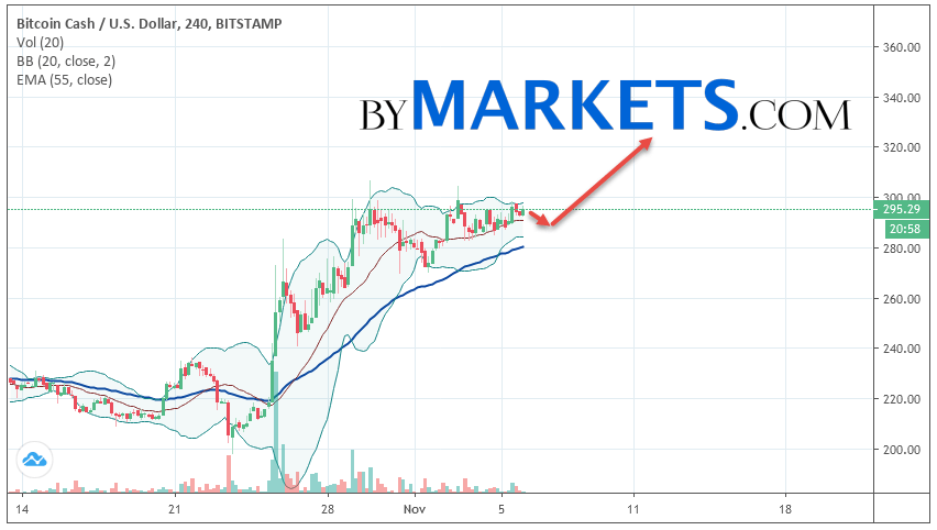 Cryptocurrency Bitcoin Cash (BCH/USD) is trading at 295. Cryptocurrency quotes are trading above the moving average with a period of 55. This indicates a bullish trend on Bitcoin Cash. At the moment, cryptocurrency quotes are moving near the upper border of the Bollinger Bands indicator stripes.