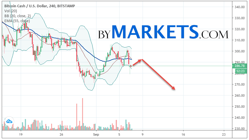 Cryptocurrency Bitcoin Cash (BCH/USD) is trading at 286. Cryptocurrency quotes are trading below the moving average with a period of 55. This indicates a bearish trend on Bitcoin Cash. At the moment, cryptocurrency quotes are moving near the lower border of the Bollinger Bands indicator stripes.