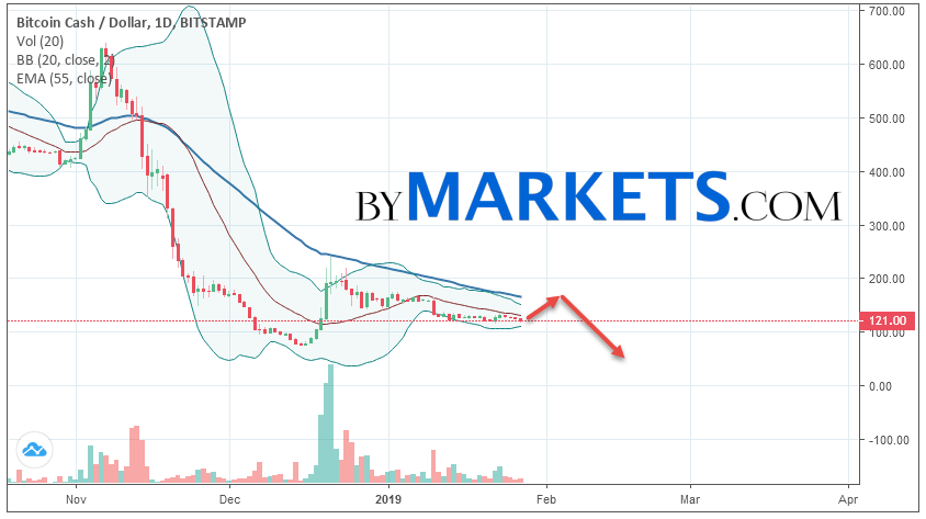Cryptocurrency Bitcoin Cash (BCH/USD) is trading at 121. Cryptocurrency quotes are trading below the moving average with a period of 55. This indicates a bearish trend for Bitcoin Cash. At the moment, cryptocurrency quotes are moving near the lower border of the Bollinger Bands indicator bands.
