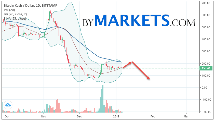 Cryptocurrency Bitcoin Cash (BCH/USD) is trading at 158. Cryptocurrency quotes are trading below the moving average with a period of 55. This indicates a bearish trend for Bitcoin Cash. At the moment, cryptocurrency quotes are moving near the middle border of the Bollinger Bands indicator.