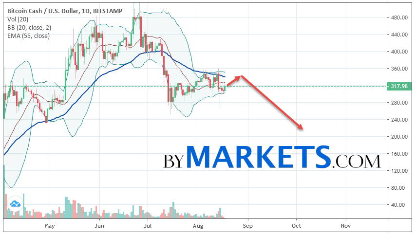 Bitcoin Cash (BCHUSD) weekly forecast on August 19 — 25, 2019 implies a test level of 345. Further, it is expected to continue falling to the area below the level of 220. The conservative area for selling Bitcoin Cash is located area of 355. Canceling the option of falling cryptocurrency will be a breakdown of the level of 420. In this case, we can expect continuation growth.