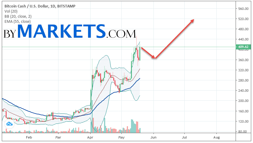 As part of the Bitcoin Cash forecast, a test of level 365 is expected. Where should we expect an attempt to continue the growth of BCH/USD and further development of the upward trend. The purpose of this movement is the area near the level of 520. The conservative area for buying of Bitcoin Cash is located near the lower border of the Bollinger Bands indicator strip at level 220.