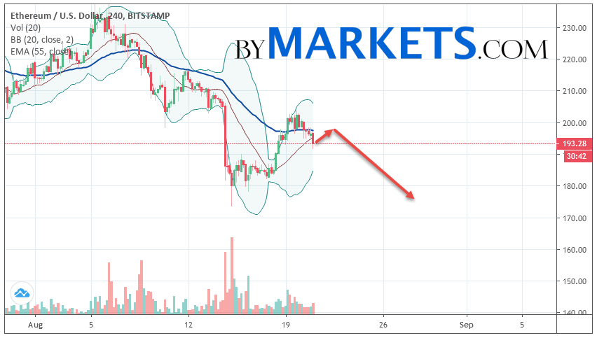 Ethereum (ETH/USD) forecast and analysis on August 22, 2019 implies a test level of 198. Further, it is expected to continue falling to the area below the level of 176. The conservative area for selling Ethereum is located area of 208. Canceling the option of falling cryptocurrency will be a breakdown of the level of 212. In this case, we can expect continuation growth.