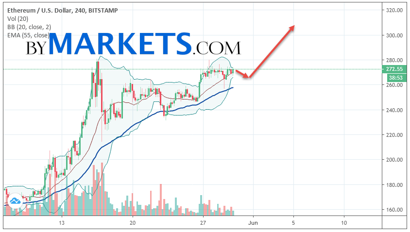 As part of the Ethereum course forecast, a test of level 265 is expected. From where we can expect an attempt to continue the growth of ETH/USD and the further development of the upward trend. The purpose of this movement is the area near the level of 305. The conservative area for buying of Ethereum is located near the lower border of the Bollinger Bands indicator strip at level 260.