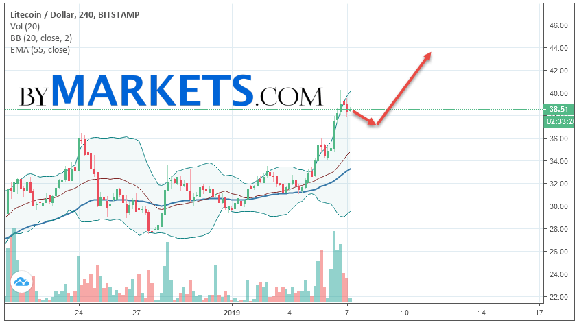 Cryptocurrency Litecoin (LTC/USD) is trading at 38.51. Cryptocurrency quotes are trading below the moving average with a period of 55. This indicates a bullish trend on Litecoin. At the moment, cryptocurrency quotes are moving near the upper border of the Bollinger Bands indicator.
