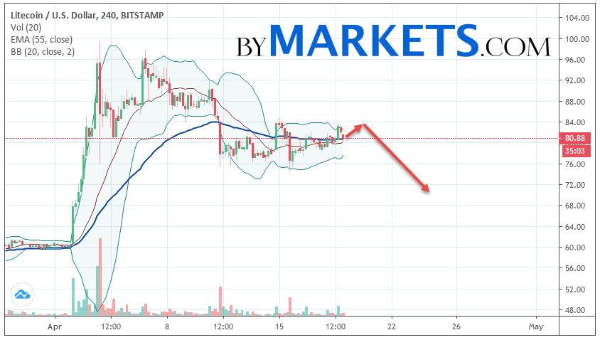 Cryptocurrency Litecoin (LTC/USD) is trading at 80.88. Cryptocurrency quotes are trading below the moving average with a period of 55. This indicates a bearish trend on Litecoin. At the moment, cryptocurrency quotes are moving near the middle border of the Bollinger Bands indicator.