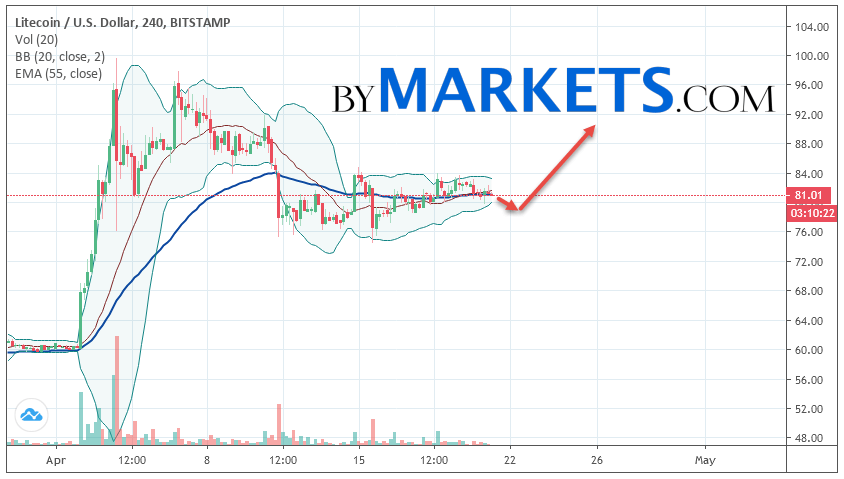 Cryptocurrency Litecoin (LTC/USD) is trading at 81.01. Cryptocurrency quotes are trading below the moving average with a period of 55. This indicates a bullish trend on Litecoin. At the moment, cryptocurrency quotes are moving near the middle border of the Bollinger Bands indicator.
