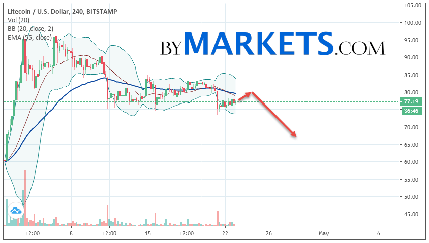 Cryptocurrency Litecoin (LTC/USD) is trading at 77.19. Cryptocurrency quotes are trading below the moving average with a period of 55. This indicates a bearish trend on Litecoin. At the moment, cryptocurrency quotes are moving near the middle border of the Bollinger Bands indicator.