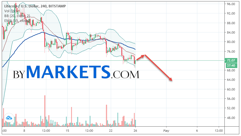 Cryptocurrency Litecoin (LTC/USD) is trading at 72.07. Cryptocurrency quotes are trading below the moving average with a period of 55. This indicates a bearish trend on Litecoin. At the moment, cryptocurrency quotes are moving near the lower border of the Bollinger Bands indicator bands.