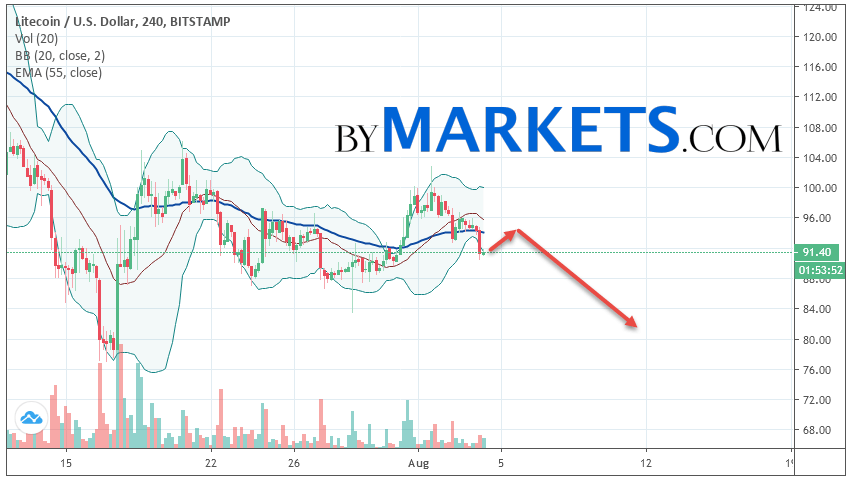 Cancellation of the option to continue the decline in the rate of Litecoin will be a breakdown of the upper border of the Bollinger Bands indicator stripes. As well as a moving average with a period of 55 and closing of quotations of the pair above the area of 102.50. This will indicate a change in the current trend in favor of the bullish for LTC/USD. In case of breakdown of the lower border of the Bollinger Bands indicator bands, we should expect an acceleration in the fall of cryptocurrency.