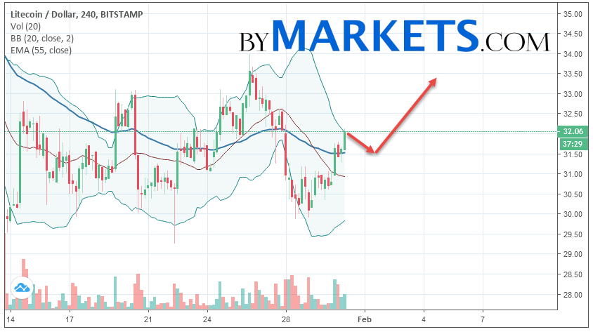 Cryptocurrency Litecoin (LTC/USD) is trading at 32.06. Cryptocurrency quotes are trading below the moving average with a period of 55. This indicates a bullish trend on Litecoin. At the moment, cryptocurrency quotes are moving near the upper border of the Bollinger Bands indicator.