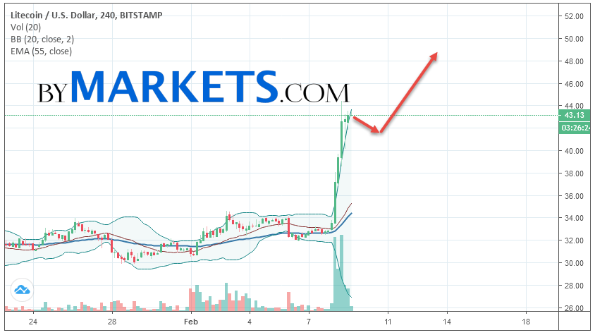 Cryptocurrency Litecoin (LTC/USD) is trading at 43.13. Cryptocurrency quotes are trading below the moving average with a period of 55. This indicates a bullish trend on Litecoin. At the moment, cryptocurrency quotes are moving near the upper border of the Bollinger Bands indicator.