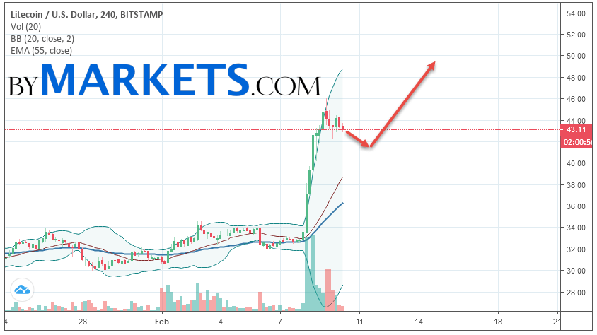 Cryptocurrency Litecoin (LTC/USD) is trading at 43.11. Cryptocurrency quotes are trading below the moving average with a period of 55. This indicates a bullish trend on Litecoin. At the moment, cryptocurrency quotes are moving near the upper border of the Bollinger Bands indicator.