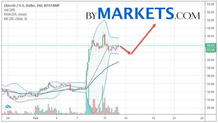 Cryptocurrency Litecoin (LTC/USD) is trading at 43.63. Cryptocurrency quotes are trading below the moving average with a period of 55. This indicates a bullish trend on Litecoin. At the moment, cryptocurrency quotes are moving near the middle border of the Bollinger Bands indicator.