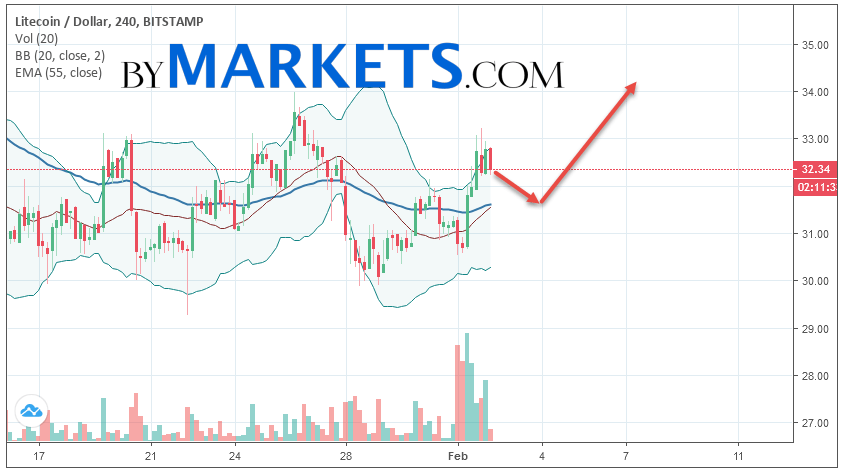 Cryptocurrency Litecoin (LTC/USD) is trading at 32.34. Cryptocurrency quotes are trading below the moving average with a period of 55. This indicates a bullish trend on Litecoin. At the moment, cryptocurrency quotes are moving near the upper border of the Bollinger Bands indicator.