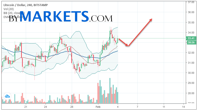 As part of the Litecoin course forecast, a test of 32.80 is expected. Where can we expect an attempt to continue the growth of LTC / USD and the further development of the upward trend. The purpose of this movement is the area near the level of 35.20. The conservative Litecoin buying area is located near the lower border of the Bollinger Bands indicator bars at 30.80.