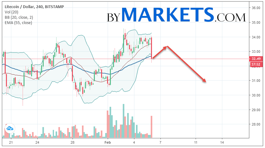 Litecoin (LTC/USD) forecast and analysis on February 7, 2019 implies a test level of 33.40. Further, it is expected to continue falling to the area below the level of 30.80. The conservative area for selling Litecoin is located area of 34.20. Canceling the option of falling cryptocurrency will be a breakdown of the level of 34.40. In this case, we can expect continuation growth.