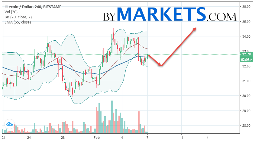 As part of the Litecoin course forecast, a test of 32.00 is expected. Where can we expect an attempt to continue the growth of LTC/USD and the further development of the upward trend. The purpose of this movement is the area near the level of 34.50. The conservative Litecoin buying area is located near the lower border of the Bollinger Bands indicator strip at 31.50.