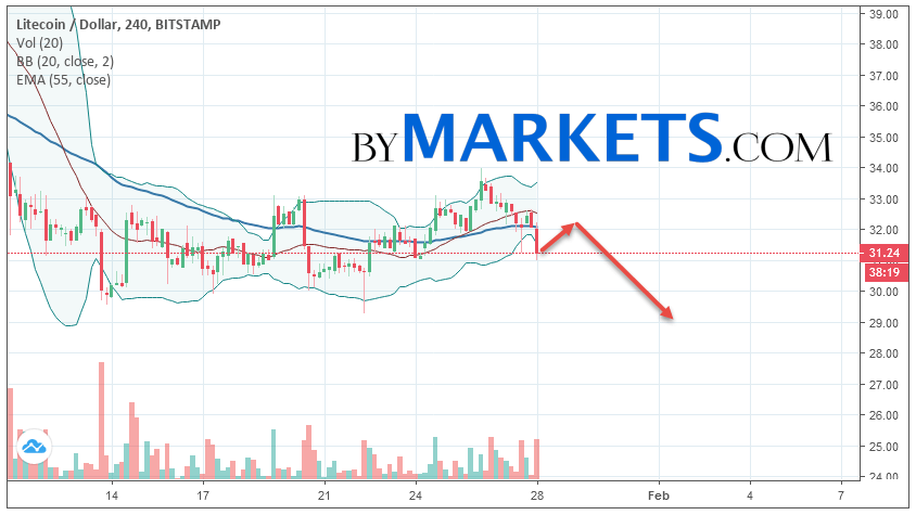 Litecoin (LTC/USD) forecast and analysis on January 29, 2019 implies a test level of 32.10. Further, it is expected to continue falling to the area below the level of 29.10. The conservative area for selling Litecoin is located area of 33.50. Canceling the option of falling cryptocurrency will be a breakdown of the level of 34.20. In this case, we can expect continuation growth.