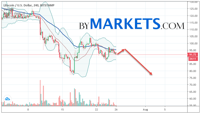 Litecoin (LTC/USD) forecast and analysis on July 27, 2019 implies a test level of 95.20. Further, it is expected to continue falling to the area below the level of 77.50. The conservative area for selling Litecoin is located area of 97.20. Canceling the option of falling cryptocurrency will be a breakdown of the level of 102.50. In this case, we can expect continuation growth.