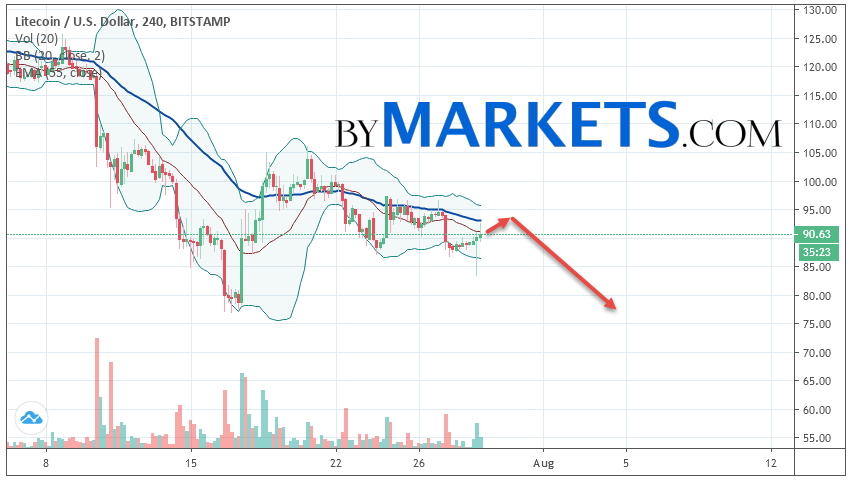 Cryptocurrency Litecoin (LTC/USD) is trading at 90.63. Cryptocurrency quotes are trading below the moving average with a period of 55. This indicates the presence of a bearish trend on Litecoin. At the moment, cryptocurrency quotes are moving near the middle border of the Bollinger Bands indicator.