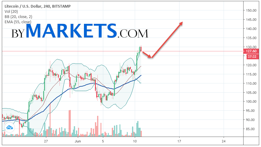 Cryptocurrency Litecoin (LTC/USD) is trading at 127.60. Cryptocurrency quotes are trading below the moving average with a period of 55. This indicates a bullish trend on Litecoin. At the moment, cryptocurrency quotes are moving near the upper border of the Bollinger Bands indicator.