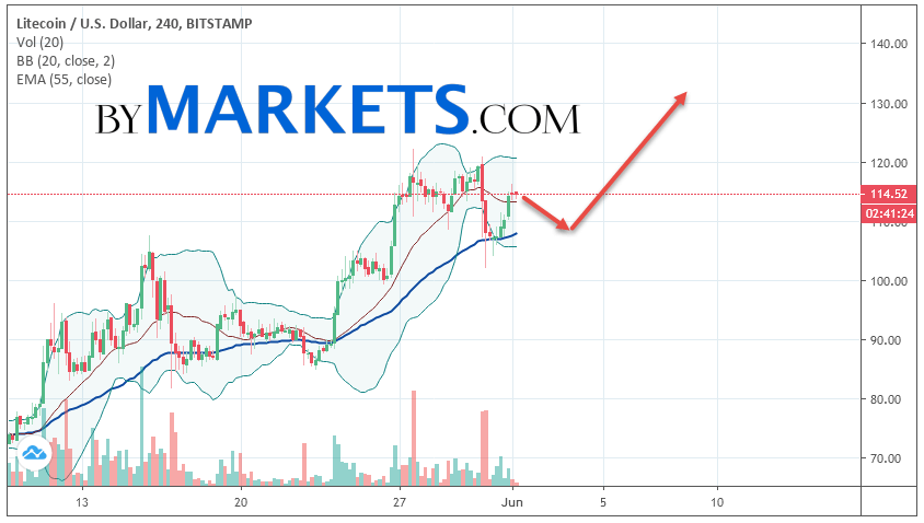 As part of the Litecoin course forecast, a test level of 108.20 is expected. Where can we expect an attempt to continue the growth of LTC/USD and the further development of the upward trend. The purpose of this movement is the area near the level of 130.50. The conservative area for buying of Litecoin is located near the lower border of the Bollinger Bands indicator bands at the level of 105.20.