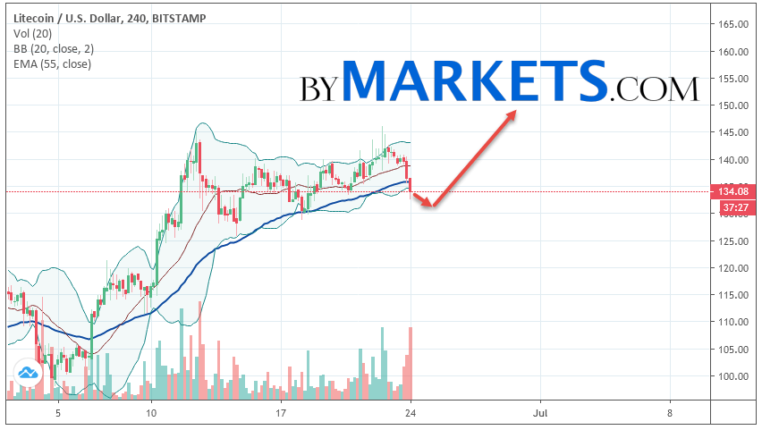 Cryptocurrency Litecoin (LTC/USD) is trading at 134.08. Cryptocurrency quotes are trading below the moving average with a period of 55. This indicates a bullish trend on Litecoin. At the moment, cryptocurrency quotes are moving near the lower border of the Bollinger Bands indicator bands.