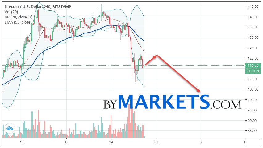 As part of the Litecoin course forecast, a test level of 111.50 is expected. Where should we expect an attempt to continue the fall of LTC/USD and further development of the downward trend. The purpose of this movement is the area near the level of 104.80. The conservative Litecoin sales area is located near the upper border of the Bollinger Bands indicator at 140.00.