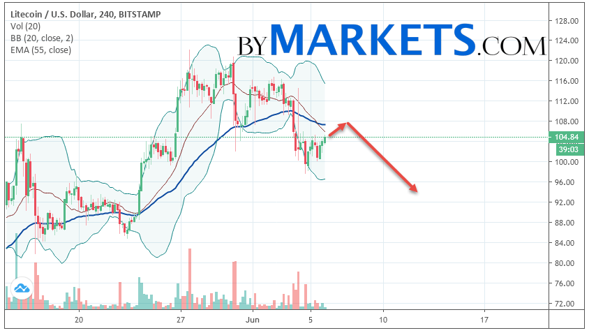 Litecoin (LTC/USD) forecast and analysis on June 7, 2019 implies a test level of 107.50. Further, it is expected to continue falling to the area below the level of 94.20. The conservative area for selling Litecoin is located area of 115.80. The cancellation of the option of falling cryptocurrency will be the breakdown level 116.80. In this case, we can expect continued growth.