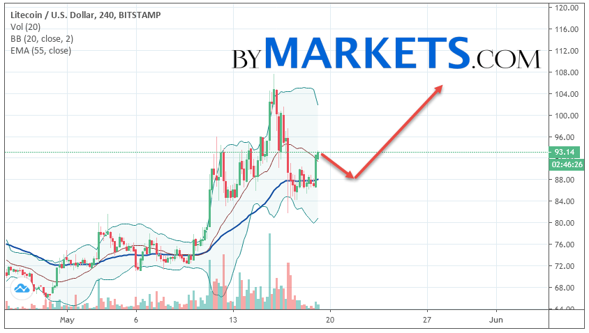 Cryptocurrency Litecoin (LTC/USD) is trading at 93.14. Cryptocurrency quotes are trading below the moving average with a period of 55. This indicates a bullish trend on Litecoin. At the moment, cryptocurrency quotes are moving near the middle border of the Bollinger Bands indicator.