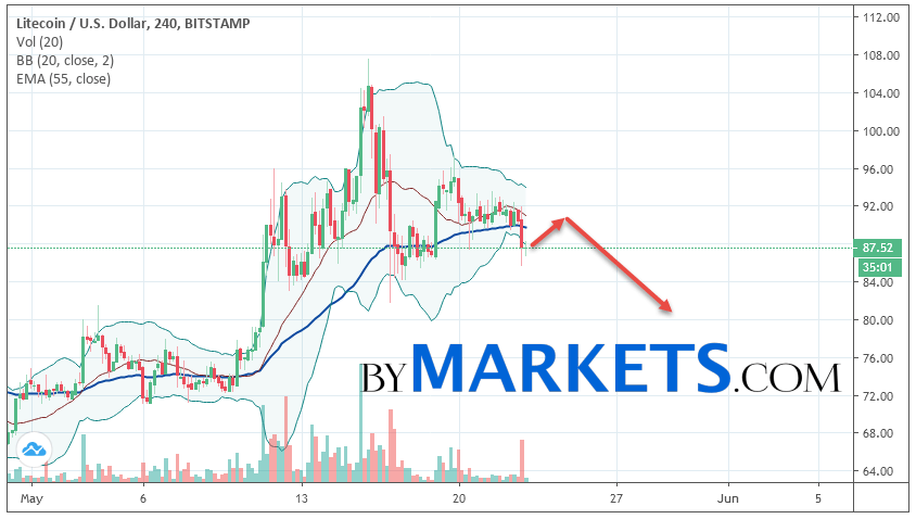 Cryptocurrency Litecoin (LTC/USD) is trading at 87.52. Cryptocurrency quotes are trading below the moving average with a period of 55. This indicates a bearish trend on Litecoin. At the moment, cryptocurrency quotes are moving near the lower border of the Bollinger Bands indicator bands.