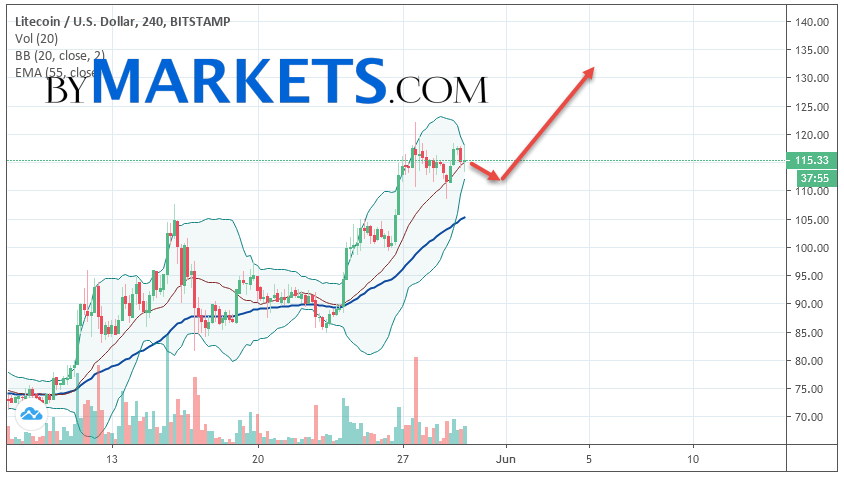 As part of the Litecoin course forecast, a test level of 112.40 is expected. Where can we expect an attempt to continue the growth of LTC/USD and the further development of the upward trend. The purpose of this movement is the area near the level of 132.00 The conservative area for buying of Litecoin is located near the lower border of the Bollinger Bands indicator strip at level 105.20.