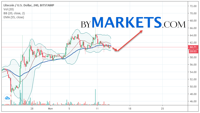 Cryptocurrency Litecoin (LTC/USD) is trading at 60.71. Cryptocurrency quotes are trading below the moving average with a period of 55. This indicates a bullish trend on Litecoin. At the moment, cryptocurrency quotes are moving near the middle border of the Bollinger Bands indicator stripes.