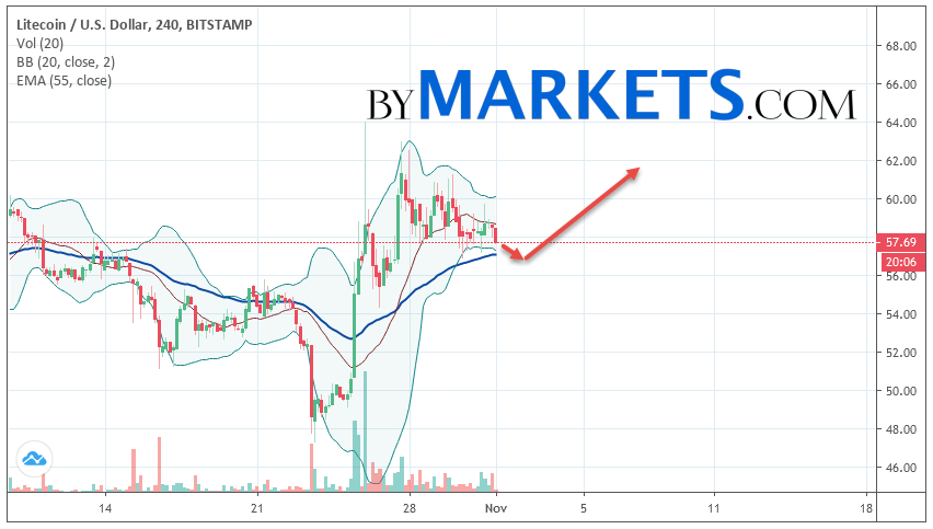 Cryptocurrency Litecoin (LTC/USD) is trading at 57.69. Cryptocurrency quotes are trading below the moving average with a period of 55. This indicates a bullish trend on Litecoin. At the moment, cryptocurrency quotes are moving near the lower border of the Bollinger Bands indicator stripes.