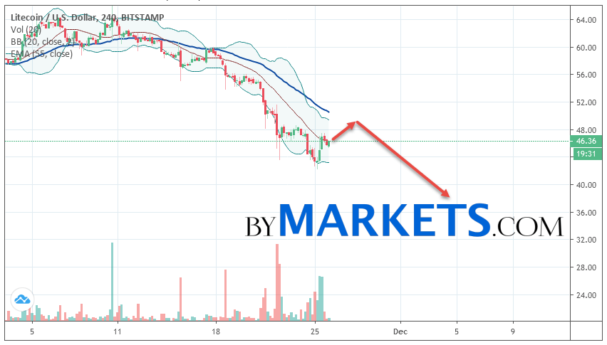 As part of the Litecoin course forecast, a test level of 49.20 is expected. Where should we expect an attempt to continue the fall of LTC/USD and the further development of the downward trend. The purpose of this movement is the area near the level of 38.20. The conservative sales area for Litecoin is located near the upper border of the Bollinger Bands indicator strip at 50.10.