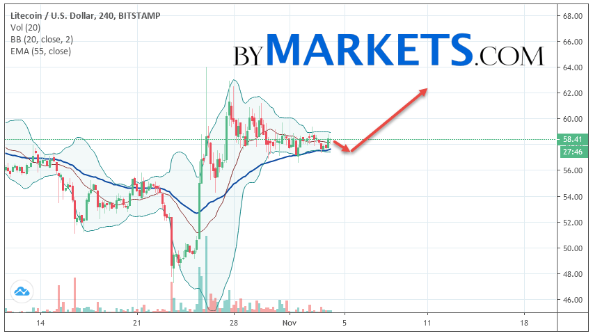 Litecoin (LTC/USD) forecast and analysis on November 5, 2019 implies a test level of 57.50. Further growth is expected to continue to the area above the level of 62.20. The conservative area for buying Litecoin is located area of 57.20. The cancellation of the cryptocurrency growth option will be the breakdown of the level of 54.50. In this case, we should expect the continuation of the fall.