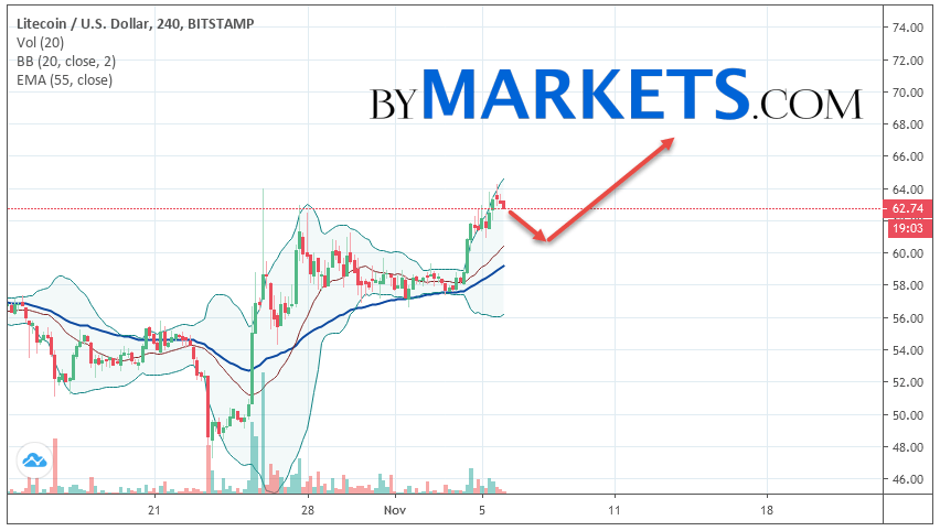 Cryptocurrency Litecoin (LTC/USD) is trading at 62.74. Cryptocurrency quotes are trading below the moving average with a period of 55. This indicates a bullish trend on Litecoin. At the moment, cryptocurrency quotes are moving near the upper border of the Bollinger Bands indicator stripes.