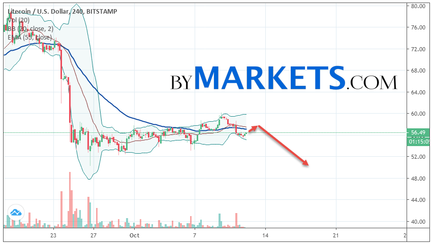 Cryptocurrency Litecoin (LTC/USD) is trading at 56.49. Cryptocurrency quotes are trading below the moving average with a period of 55. This indicates the presence of a bearish trend on Litecoin. At the moment, cryptocurrency quotes are moving near the lower border of the Bollinger Bands indicator stripes.