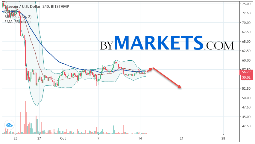 Cryptocurrency Litecoin (LTC/USD) is trading at 56.79. Cryptocurrency quotes are trading below the moving average with a period of 55. This indicates the presence of a bearish trend on Litecoin. At the moment, cryptocurrency quotes are moving near the upper border of the Bollinger Bands indicator stripes.