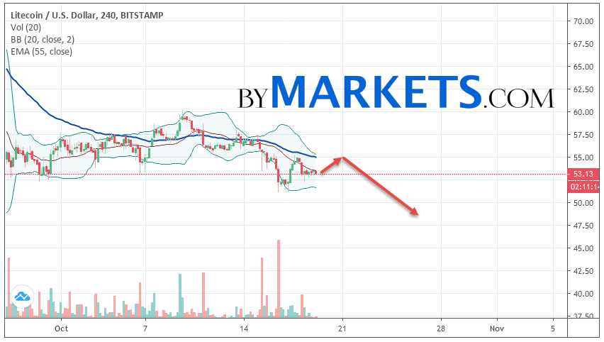 Litecoin (LTC/USD) forecast and analysis on October 20, 2019 implies a test level of 55.00. Further, it is expected to continue falling to the area below the level of 48.20. The conservative area for selling Litecoin is located area of 55.30. Canceling the option of falling cryptocurrency will be a breakdown of the level of 60.50. In this case, we can expect continuation growth.